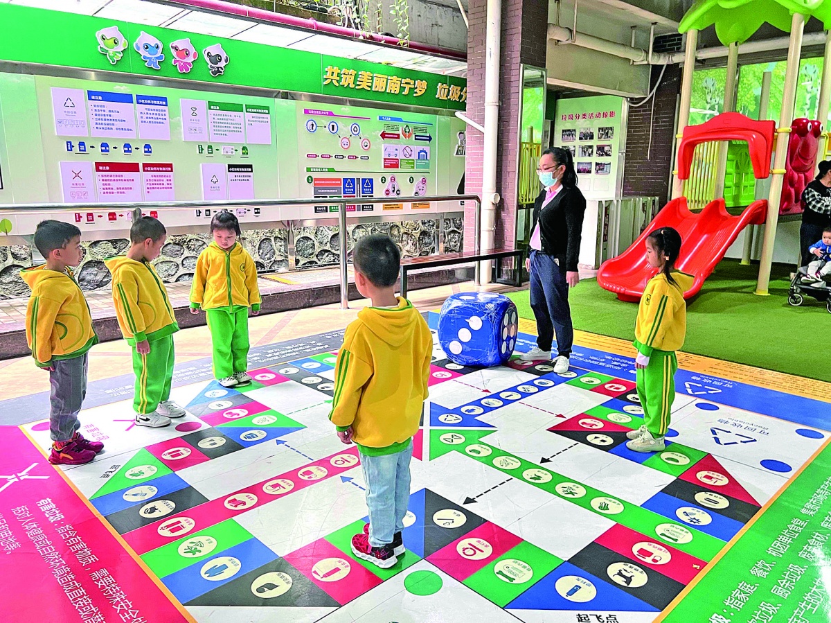 “爱南宁,爱分类。”5月16日上午,记者在盛天茗城小区看到,小区内有很多垃圾分类主题宣传海报和提示牌,并设置了垃圾分类宣教基地,通过游戏模拟体验生活垃圾投放。