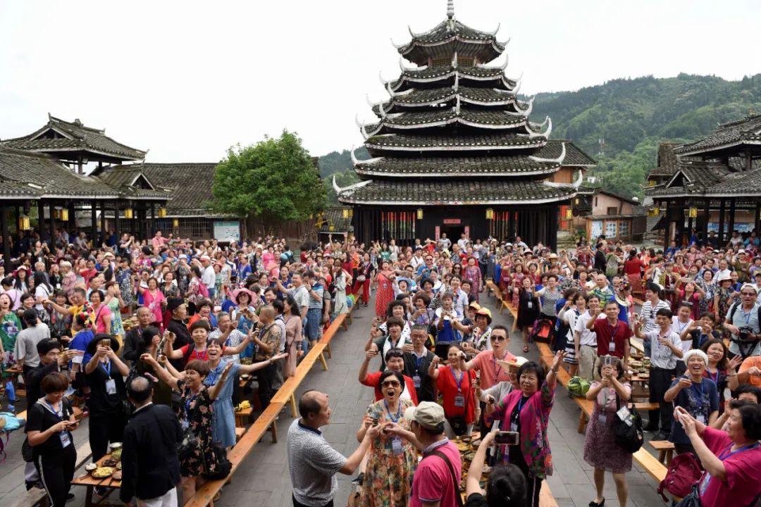 ▲游客在三江侗族自治县林溪镇冠洞村冠小侗寨共进百家宴。龚普康 摄