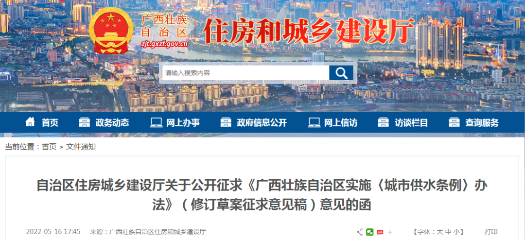为进一步加强城市供水管理,保障城市生活、生产及公共服务等用水,广西住房城乡建设厅近日组织起草了《广西壮族自治区实施〈城市供水条例〉办法》(修订草案征求意见稿),目前正面向全社会公开征求意见。修订草案征求意见稿拟删除关于用户缴纳水费滞纳金的相关内容,修改完善关于计量装置检定、更换及费用支付内容等。