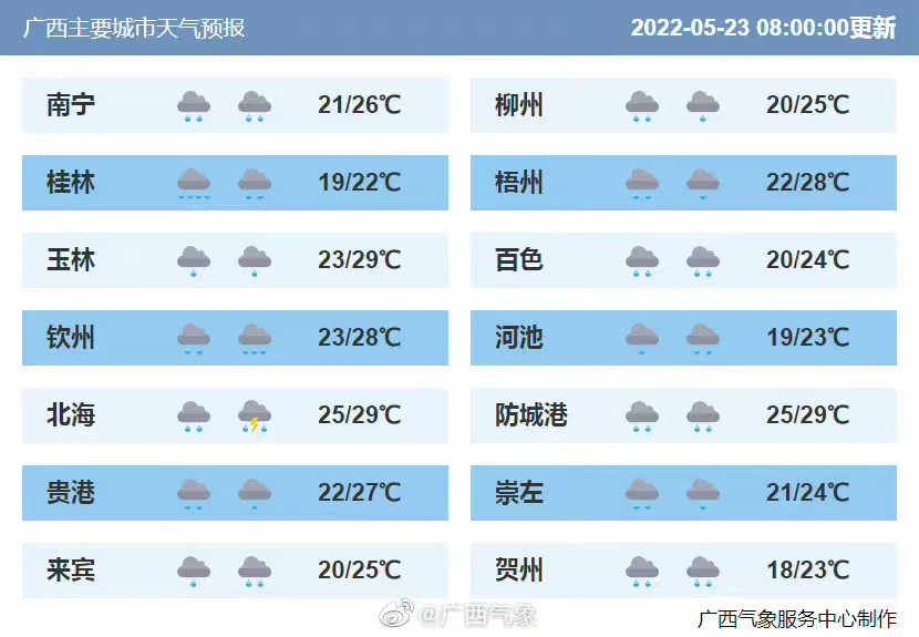 南宁市:今天白天中雨,局部大雨,偏东风2~3级,最低气温22℃,最高气温26℃。