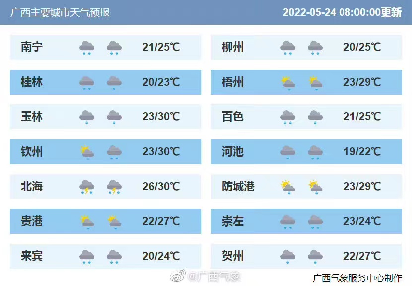 预计今天白天,全区大部依旧阴雨笼罩,较强降雨区仍在桂北、桂西及沿海,有中到大雨为主,局部暴雨;25-26日,雨势稍有减弱,但部分地区仍能达到中雨量级,局部大雨到暴雨。