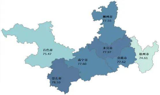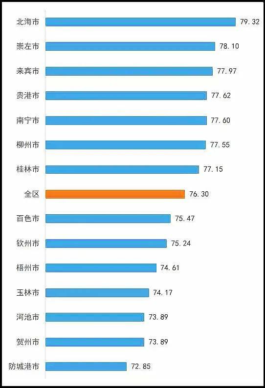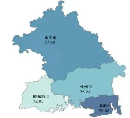 北部湾经济区4个城市的满意度平均分为76.25分,西江经济区7个城市的满意度平均分为75.04分。测评数据显示,社会消费品零售总额越高的城市群内满意度差距越小,城镇居民人均可支配收入高的城市满意度得分相对较高。
