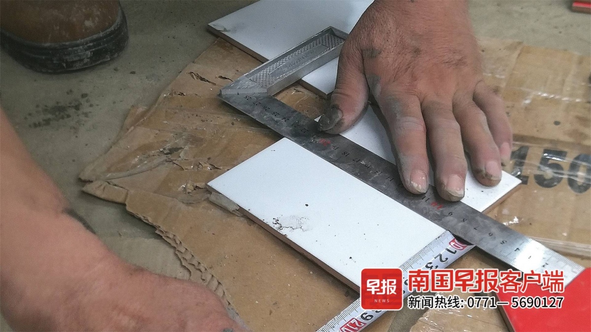 “缝隙宽度不达标,10块砖一行贴过去,总长就得超,误差1毫米也扣分。”裁判员说,工人切割好瓷砖后,还要用打磨器打磨边沿以防毛刺影响而超长。“贴瓷砖也是个精细活。”