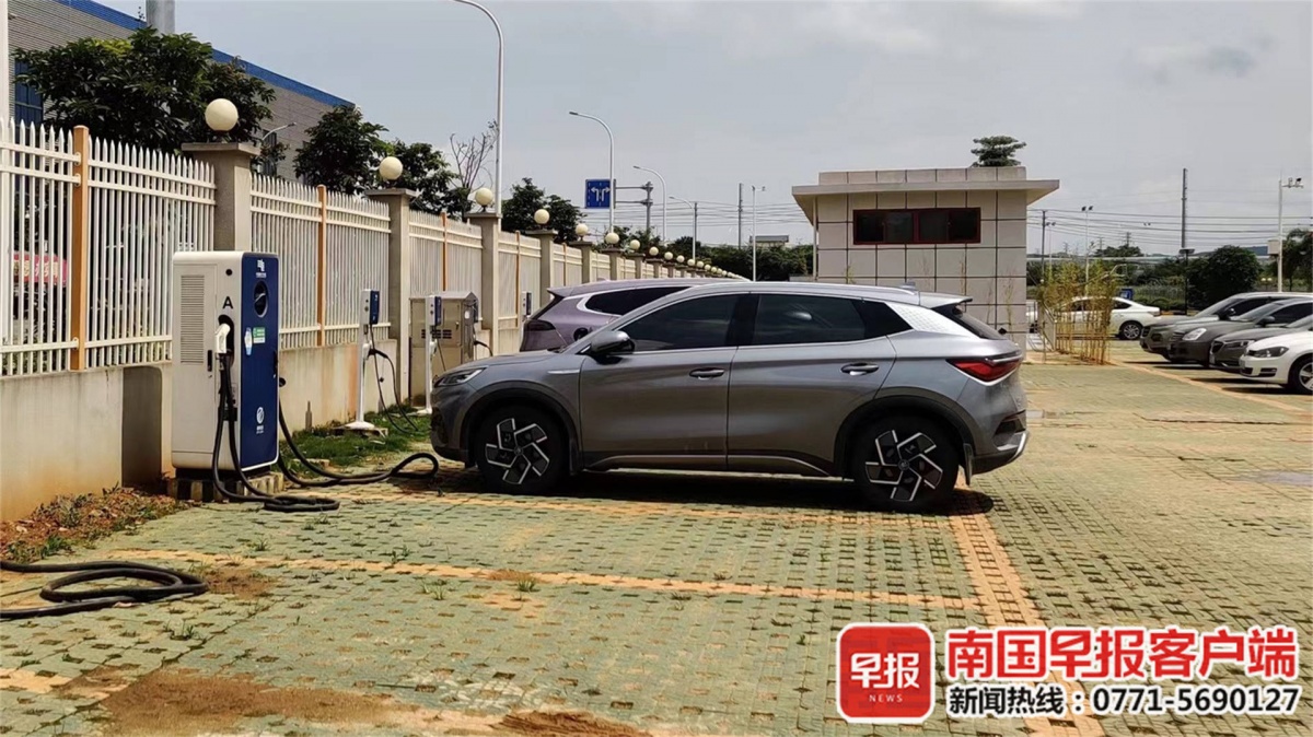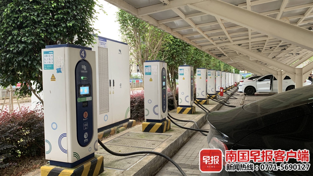 ▲新能源汽车正在公共充电桩充电。南国早报客户端 记者 陆欣楠 摄
