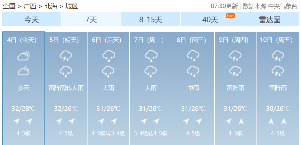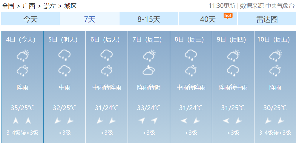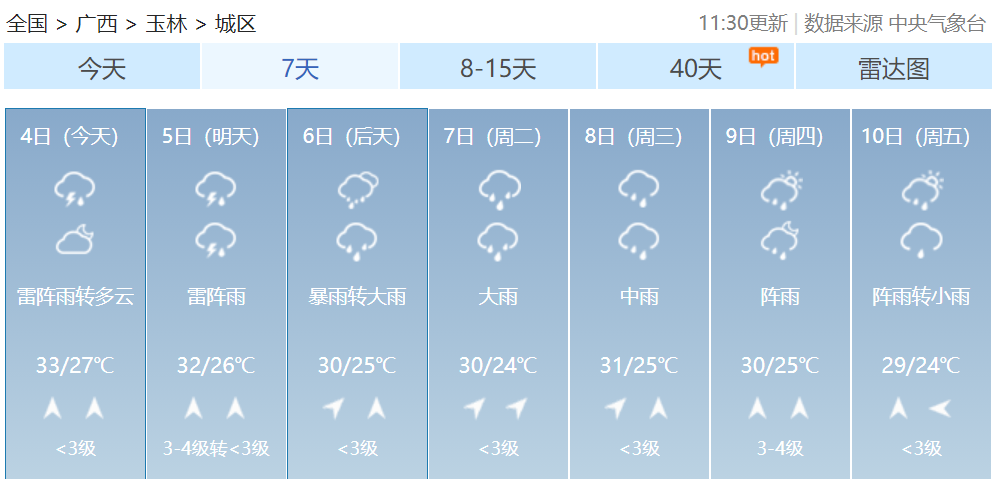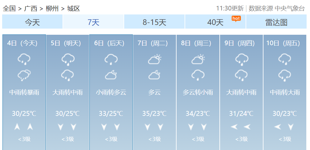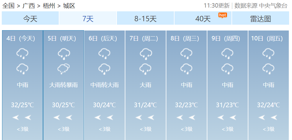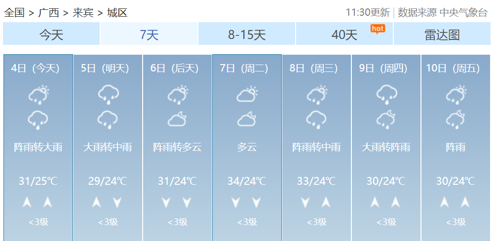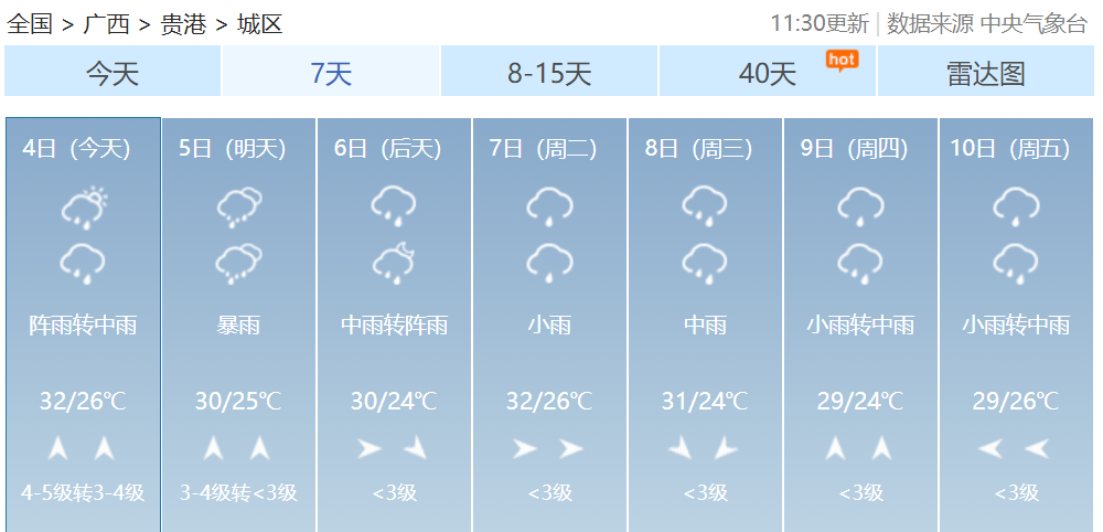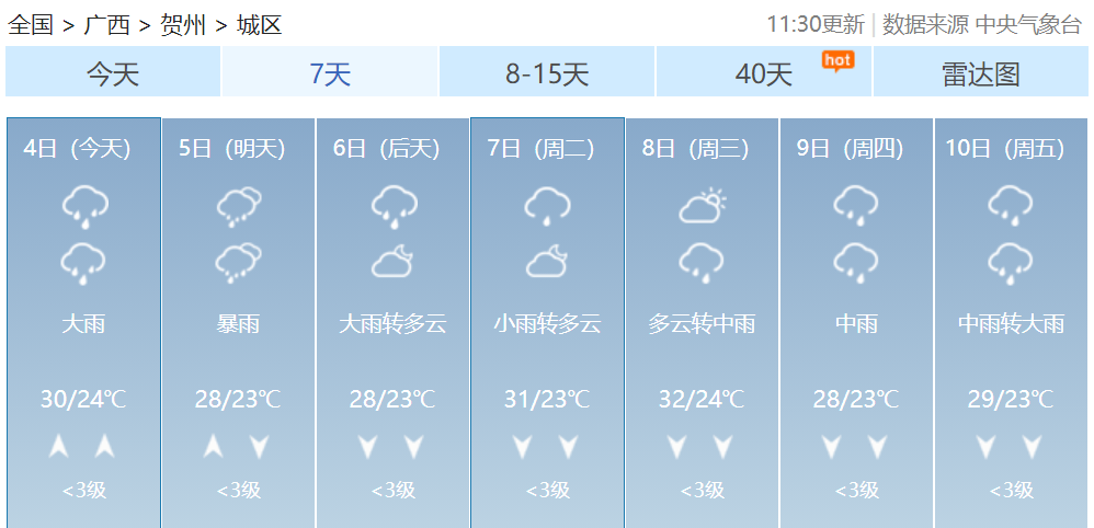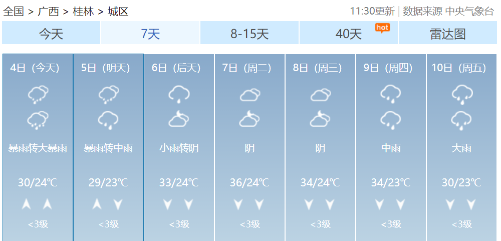 其中桂林、柳州、河池、百色、贺州、来宾等市及梧州、贵港、南宁、玉林、崇左五市北部有大雨到暴雨,局部大暴雨到特大暴雨并伴有短时雷暴大风等强对流天气。