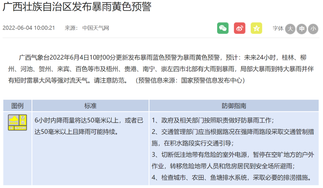 广西气象台6月4日10时00分更新发布暴雨蓝色预警为暴雨黄色预警,预计:未来24小时,桂林、柳州、河池、贺州、来宾、百色等市及梧州、贵港、南宁、崇左四市北部有大雨到暴雨,局部大暴雨到特大暴雨并伴有短时雷暴大风等强对流天气。