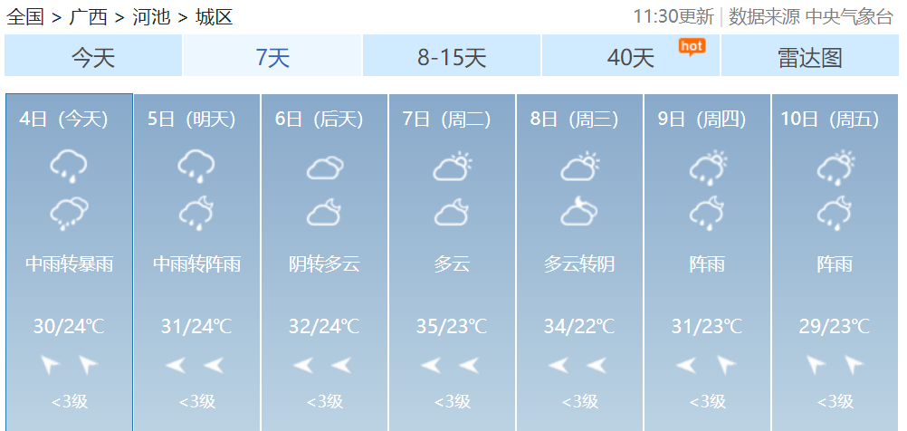 其中河池、柳州、桂林等市及百色、贺州、来宾三市北部有大雨到暴雨,局部大暴雨到特大暴雨并伴有短时雷暴大风等强对流天气。