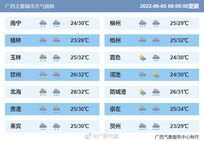 6日,贺州、梧州、贵港、来宾、玉林、钦州、防城港、北海等市及南宁市东部、桂林市南部的部分地区有大雨到暴雨,局部大暴雨,并伴有短时雷暴大风等强对流天气,我区其它地区阴天有小到中雨,局部大雨。