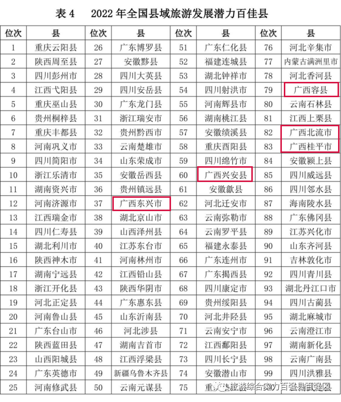2022年全国县域旅游发展潜力百佳县,广西五地入选,其中,东兴市(第37位),兴安县(第60位),容县(第79位),北流市(第82位),桂平市(第83位)。