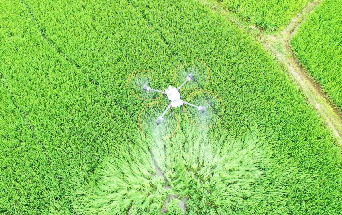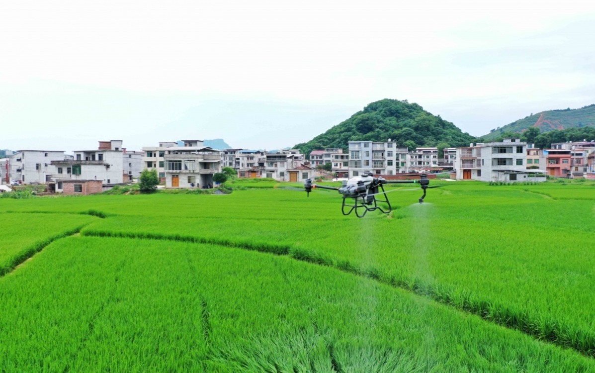仲夏时节,柳州市融安县10万余亩早稻进入分蘖期,当地组织无人机专业分队对早稻进行统防统治,提高水稻管理质量和效能,确保粮食安全,助力农民增产增收。图为6月14日,在柳州市融安县大良镇和南村,无人机在田间进行喷药作业。通讯员 谭凯兴 摄