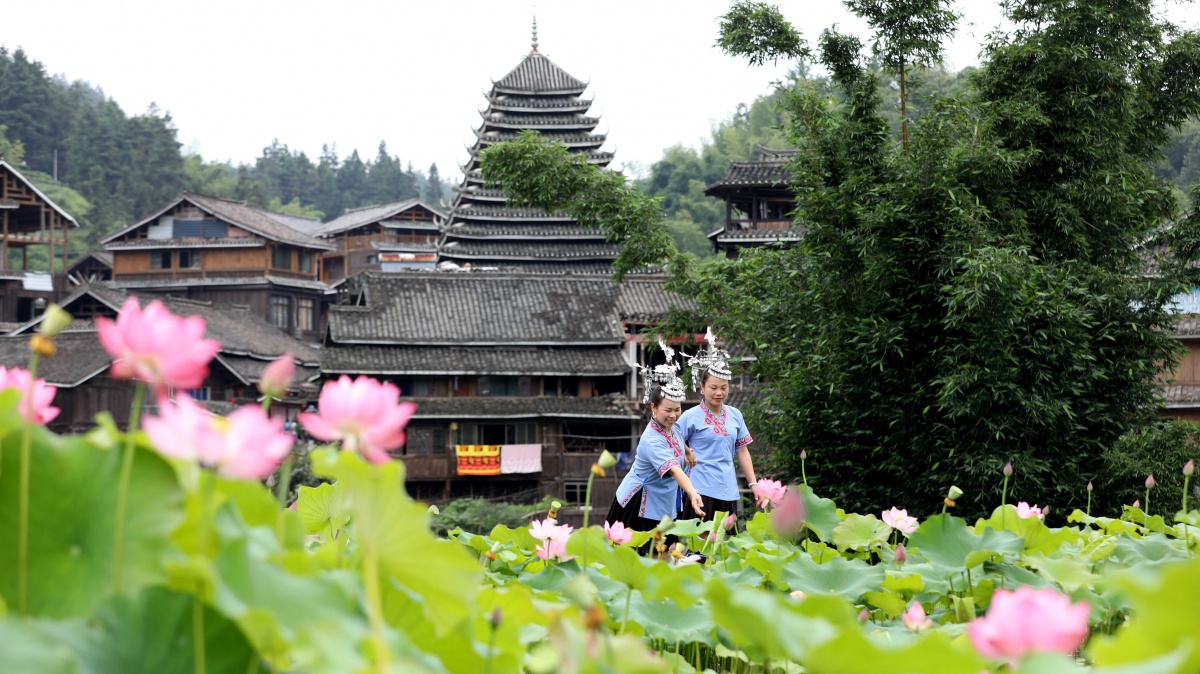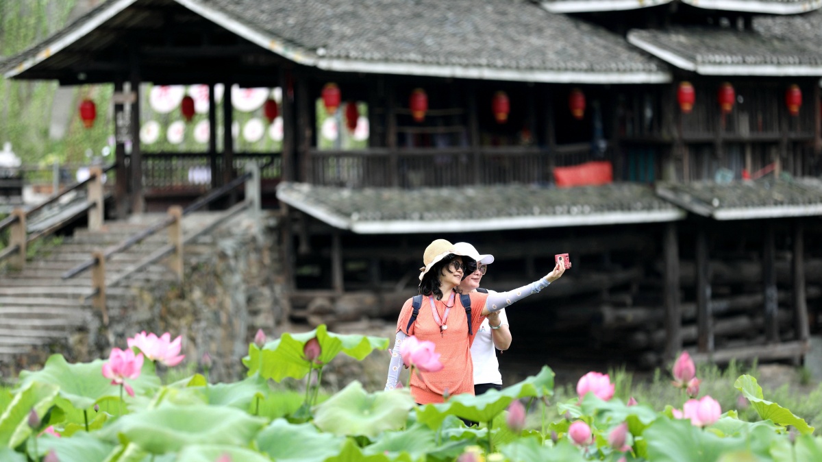 近年来,三江全力推进程阳八寨创建国家AAAAA级旅游景区,投入2.3亿元完善景区基础设施建设,景区整体功能全面提升,侗乡文旅品牌进一步擦亮。图为6月15日,三江侗族自治县林溪镇程阳八寨景区合龙桥头的荷塘荷花竞相绽放,与侗寨的风雨桥、鼓楼、吊脚木楼群等特色建筑交相辉映,美不胜收,吸引众多游客前来观赏游玩“打卡”。通讯员 龙佳倩 袁拥民 摄