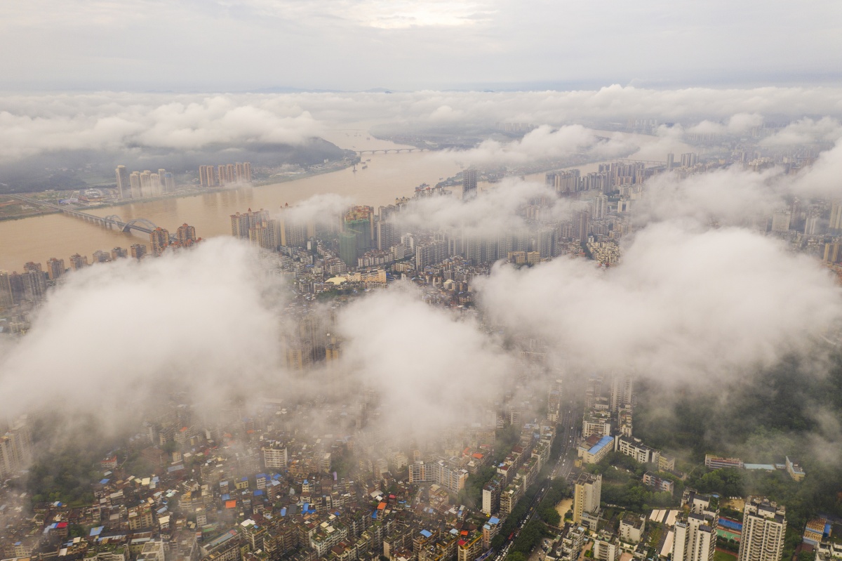 图为6月15日,航拍雨后放晴的梧州市云雾缭绕,城市楼宇、江河、青山、公园、大街小巷若隐若现。通讯员 何华文 摄
