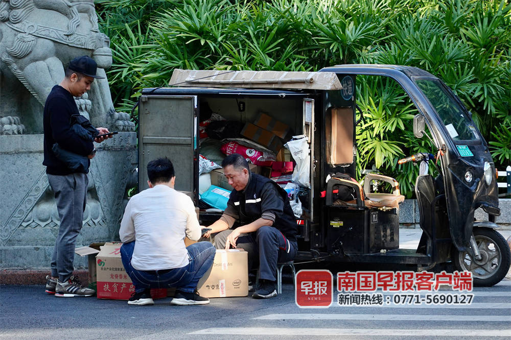 ▲民族大道上,快递员在派送快递。南国早报客户端记者 邹财麟摄(资料图)