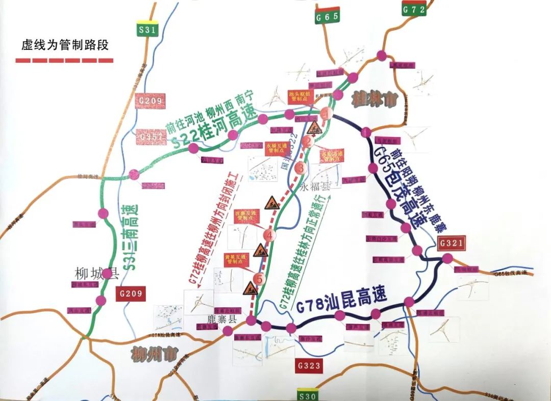 因G72泉南高速桂林往鹿寨方向改扩建施工需要,为确保广大群众出行安全,现广西公安厅交警总队高速公路管理二大队根据G72泉南高速公路广西桂林至柳州段改扩建工程交通管制工作方案,发布以下管制地点及绕行办法:
