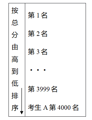 答:具体地说,“平行志愿”投档时可分为两步进行。一是先对考生分科类按总分从高到低排序,分数高的考生先检索投档。比如某理科考生A成绩排在全区全体理科考生的第4000名,需要在该生前面的3999人检索处理完成后,才轮到这位考生(如下图所示)。