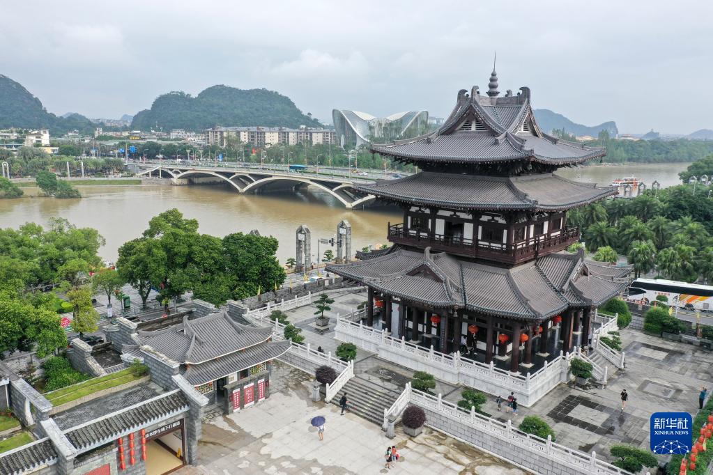 6月29日,游客在广西桂林市漓江边的逍遥楼上参观游览(无人机照片)。