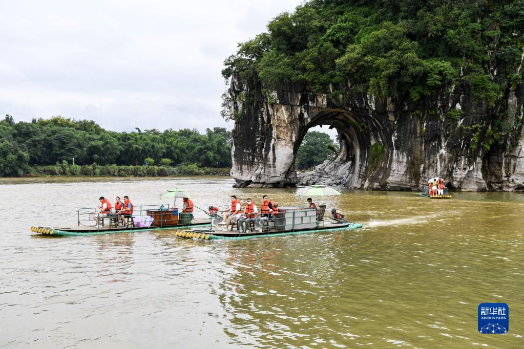 6月29日,在广西桂林,游客乘坐竹筏游览象鼻山。