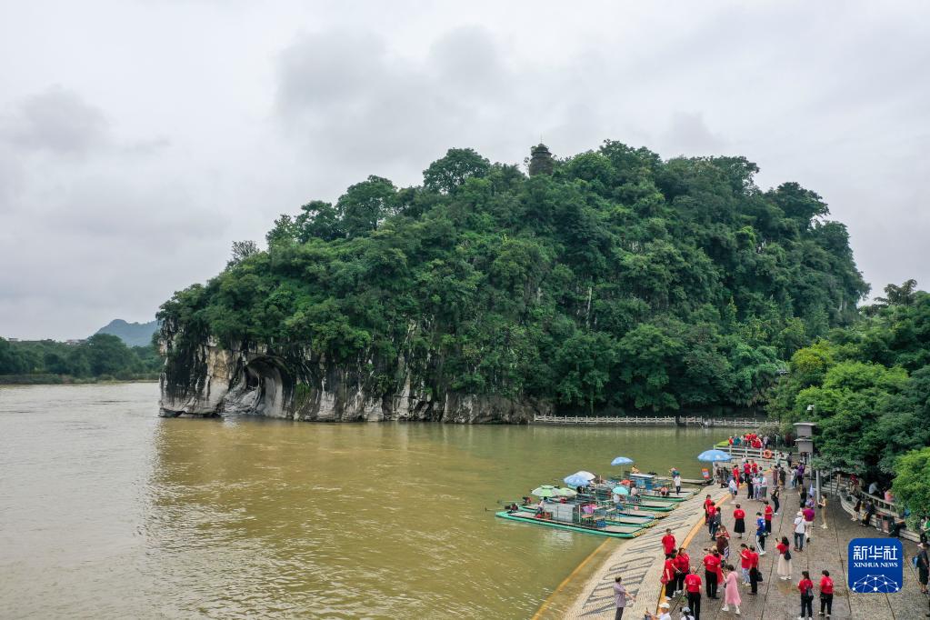 6月29日,在广西桂林,游客在象山景区内游览观光(无人机照片)。
