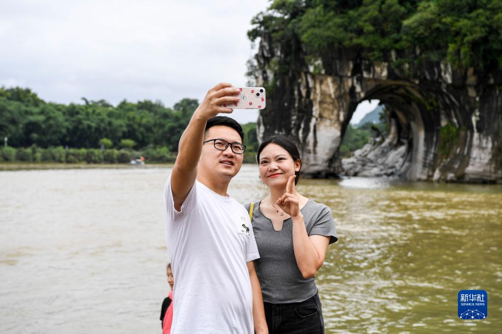 6月29日,在广西桂林,游客在象鼻山前拍照留念。