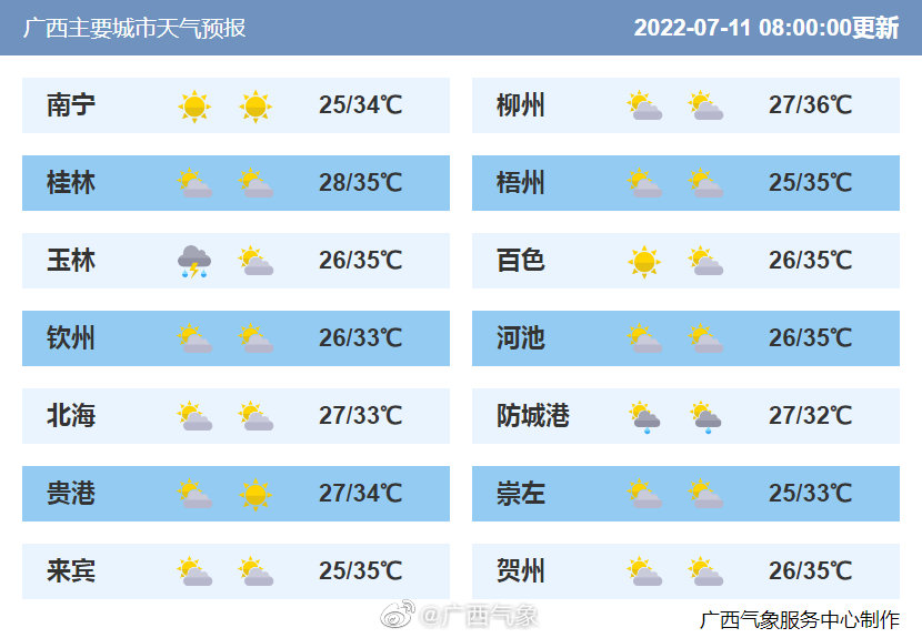 今天白天,全区多云,其中防城港、钦州、北海、玉林、梧州、贵港、南宁、崇左等市有阵雨或雷雨、局地中到大雨。全区大部地区最高气温34~36℃。