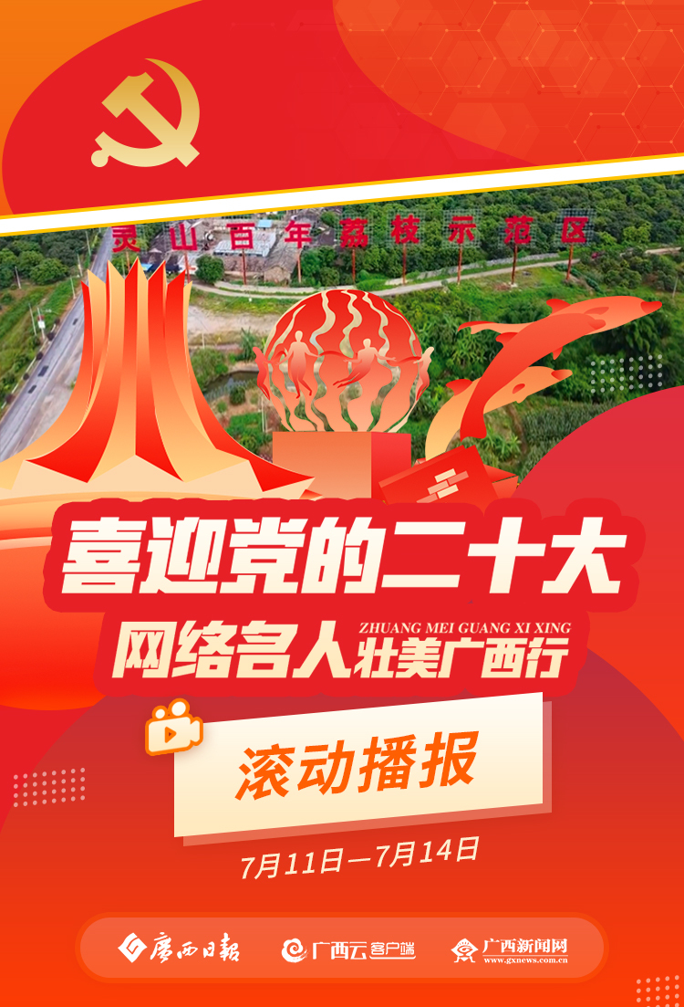 7月14日,“喜迎党的二十大——网络名人壮美广西行”继续在钦州的行程。上午,来自全国各地的40位网络名人分别参访灵山百年荔枝核心示范区、灵山一枝食品有限公司。下午,他们将参访千年香荔园、新圩镇萍塘村。广西云客户端、广西新闻网进行滚动播报,敬请关注!