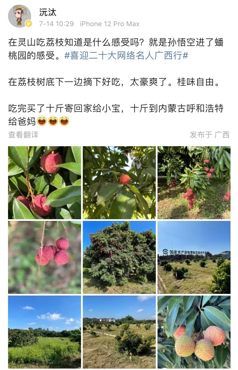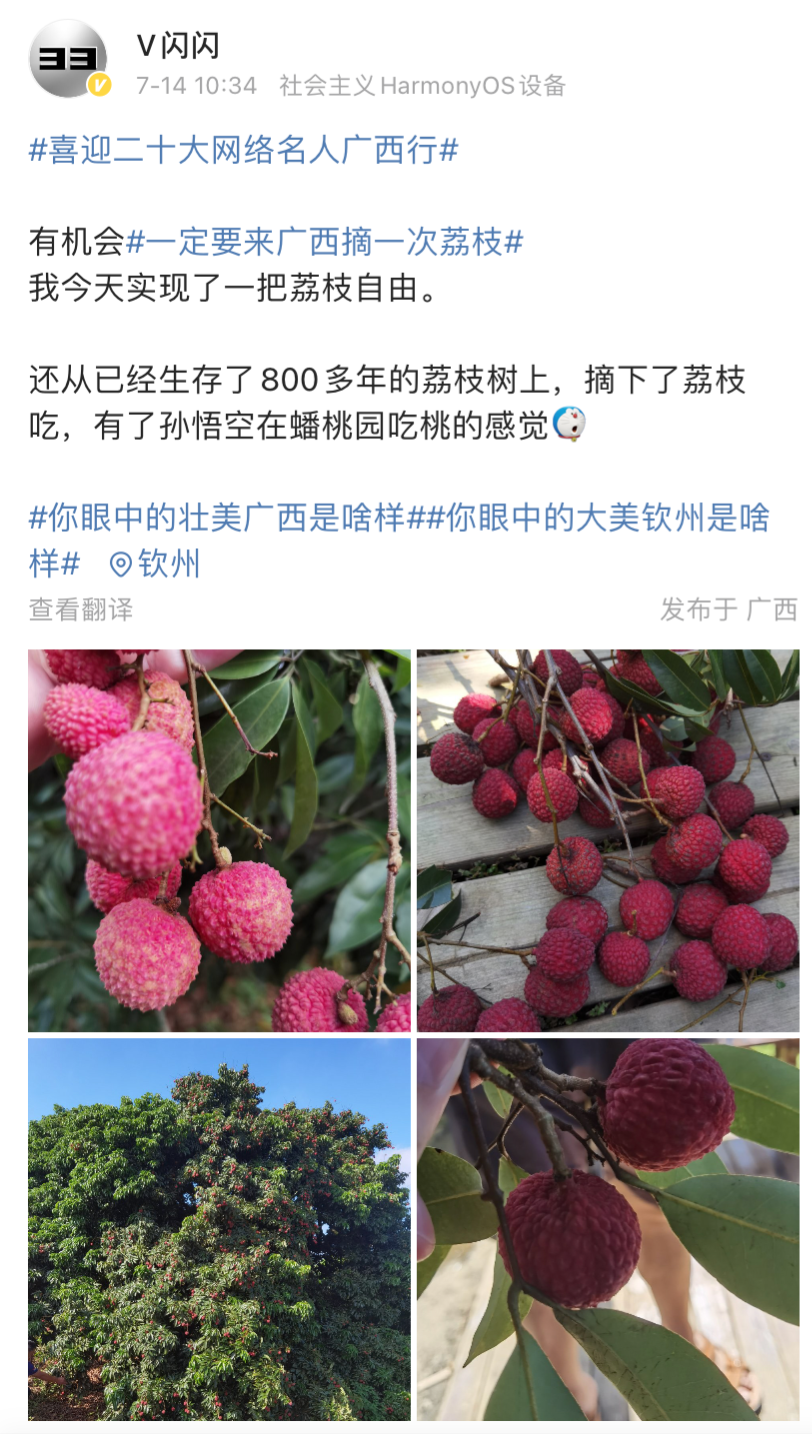 网络名人@V闪闪 :有机会#一定要来广西摘一次荔枝#,我今天实现了一把荔枝自由。还从已经生存了800多年的荔枝树上,摘下了荔枝吃,有了孙悟空在蟠桃园吃桃的感觉。