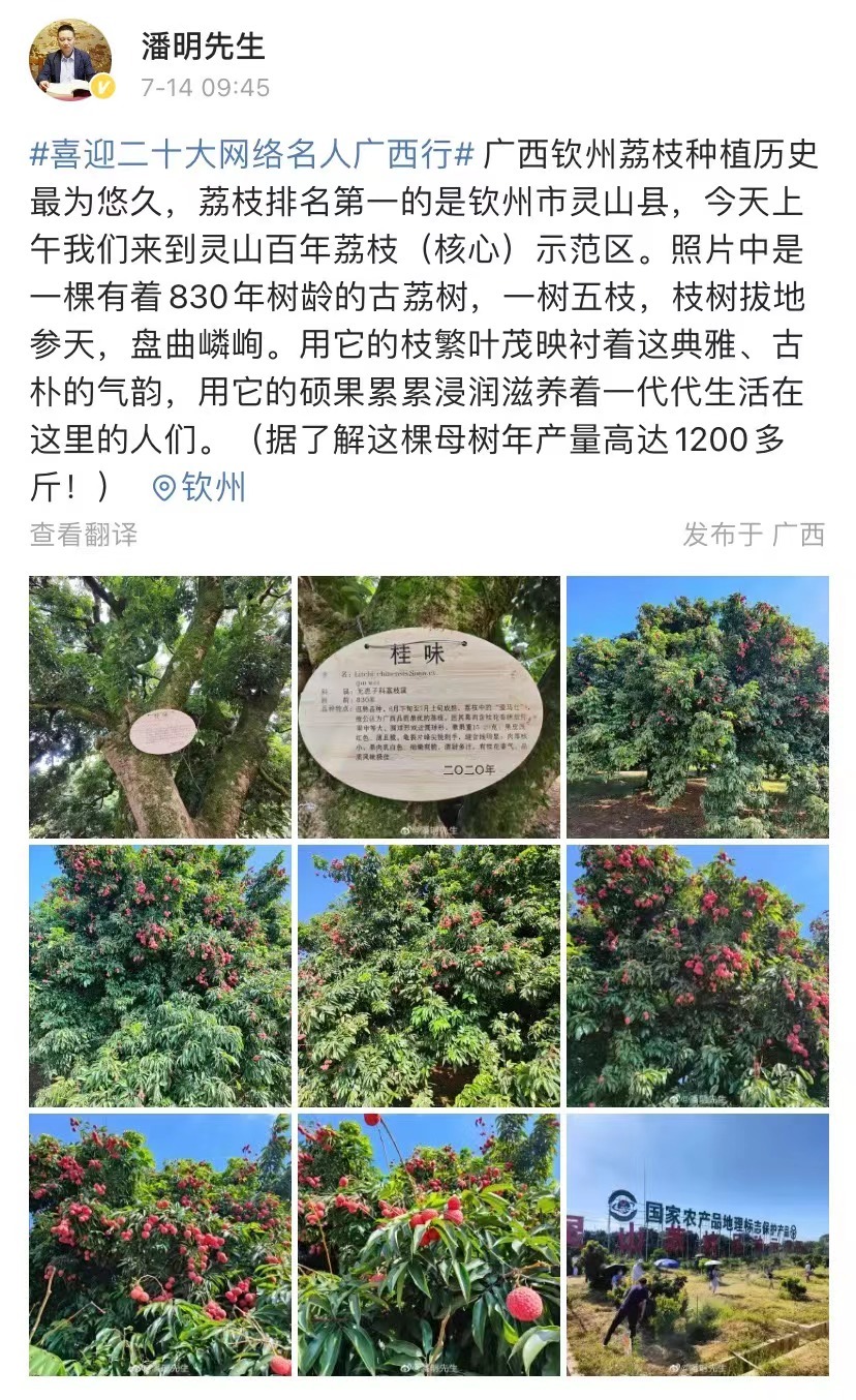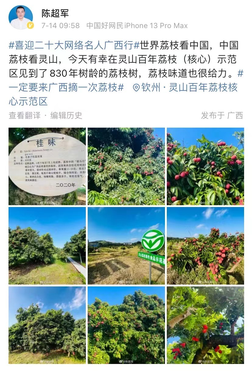 网络名人@陈超军 :世界荔枝看中国,中国荔枝看灵山,今天有幸在灵山百年荔枝(核心)示范区见到了830年树龄的荔枝树,荔枝味道也很给力。