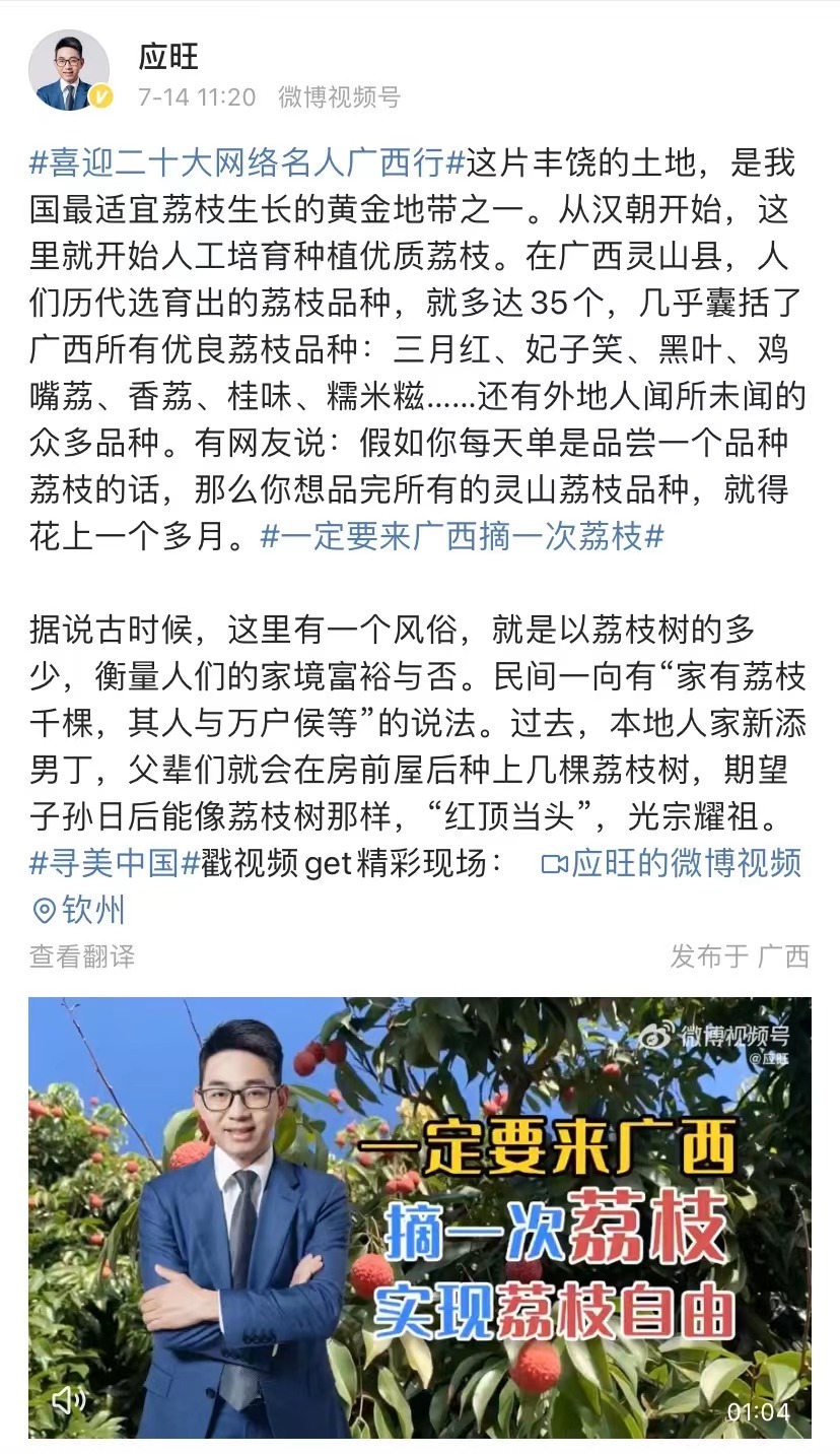 灵山百年荔枝(核心)示范区的鲜美荔枝征服了网络名人的味蕾。@小满 :在来广西之前,我一直觉得荔枝都是一个味。来了广西之后,感觉自己以前吃的荔枝都不是荔枝!@冯攀远Jason :我最喜欢吃的是桂味,肉质鲜甜,特别好吃。@学霸课长 :桂味有一股特别的清香,而且水分特别足,入口即化。吃荔枝害怕上火吗?网络名人说,其实已经在上火了,但是有美味在,再上火也不惧!