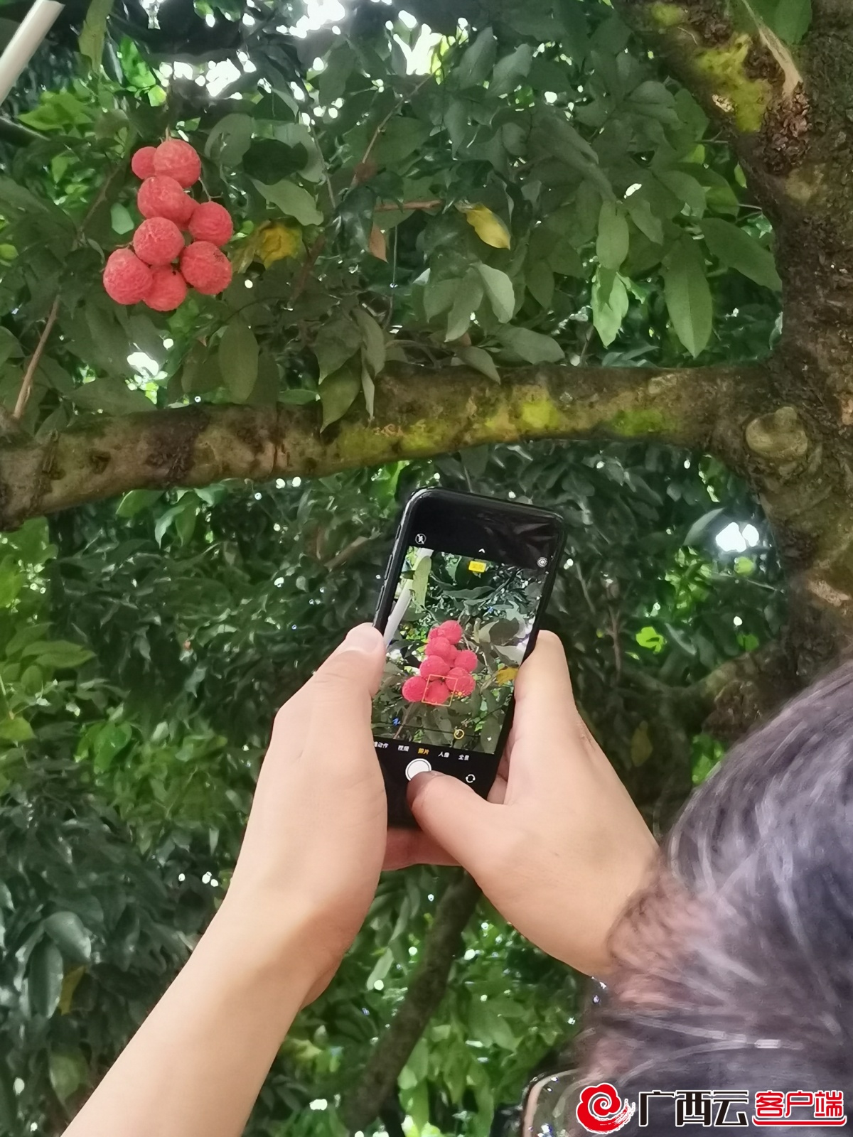 在灵山百年荔枝(核心)示范区,有两棵有着800多年荔枝树王,满树的荔枝圧弯了枝桠。网络名人们在示范区,被800多年荔枝树王吸引驻足,他们掏出装备或自拍或拍短视频或现场直播,名人秒变粉丝。