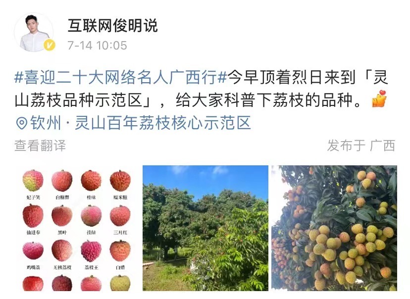网络名人@互联网俊明说 :今早顶着烈日来到「灵山荔枝品种示范区」,给大家科普下荔枝的品种。