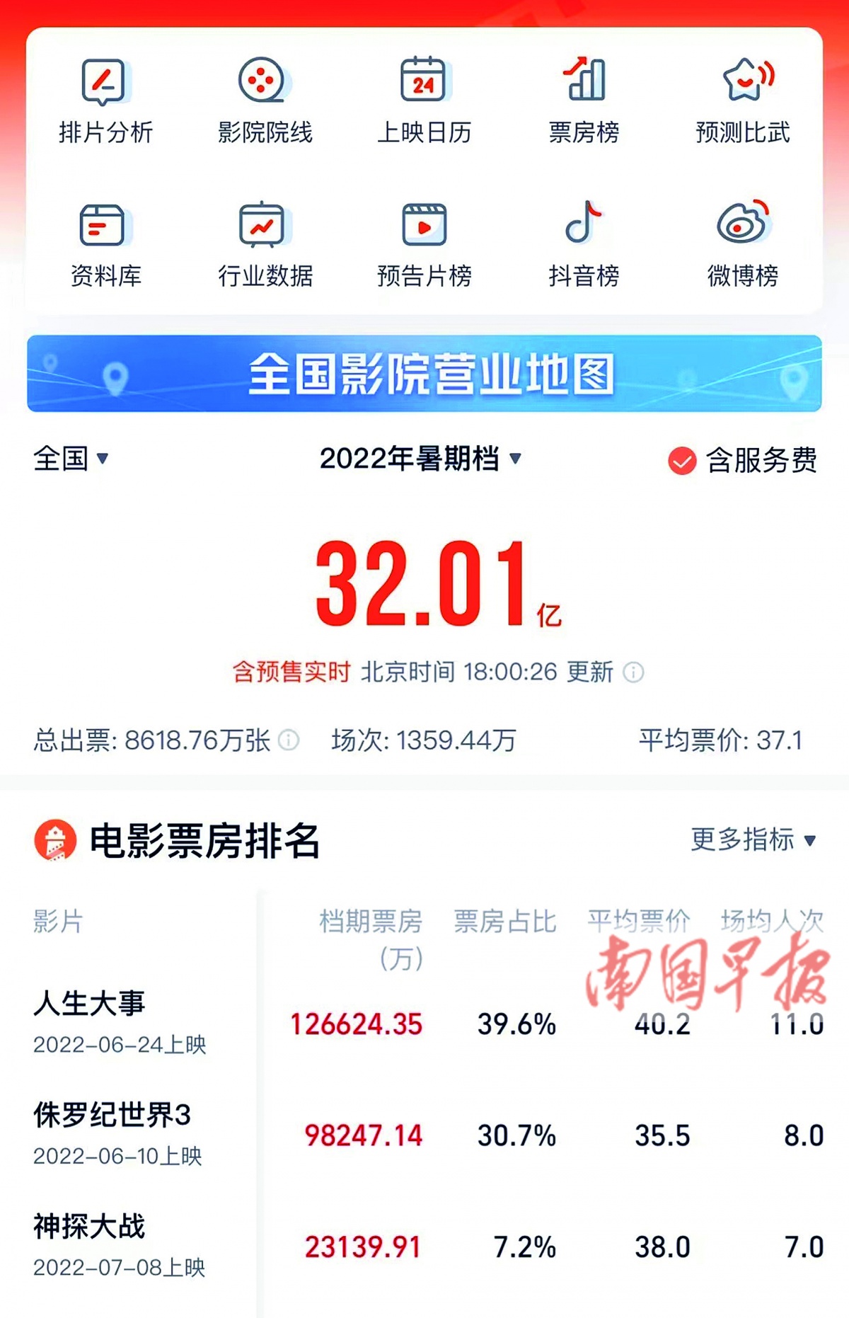 至7月13日18时,2022年暑期档全国票房超32亿元。网络截图