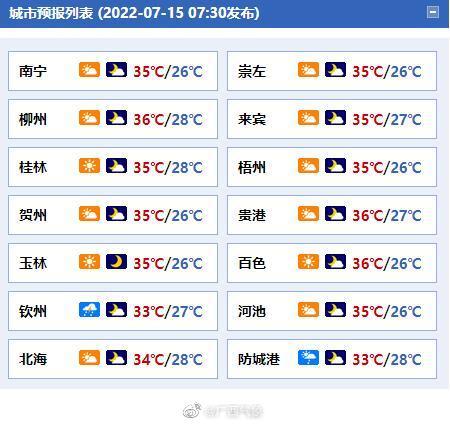 南宁市:今天白天到晚上,多云到晴,局地有阵雨或雷雨,南风1~2级,最高气温35℃,最低气温26℃