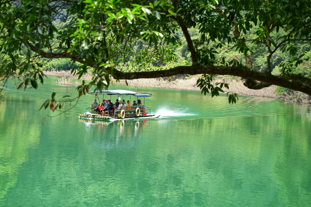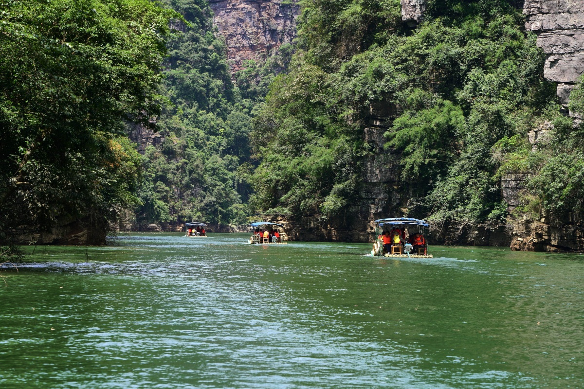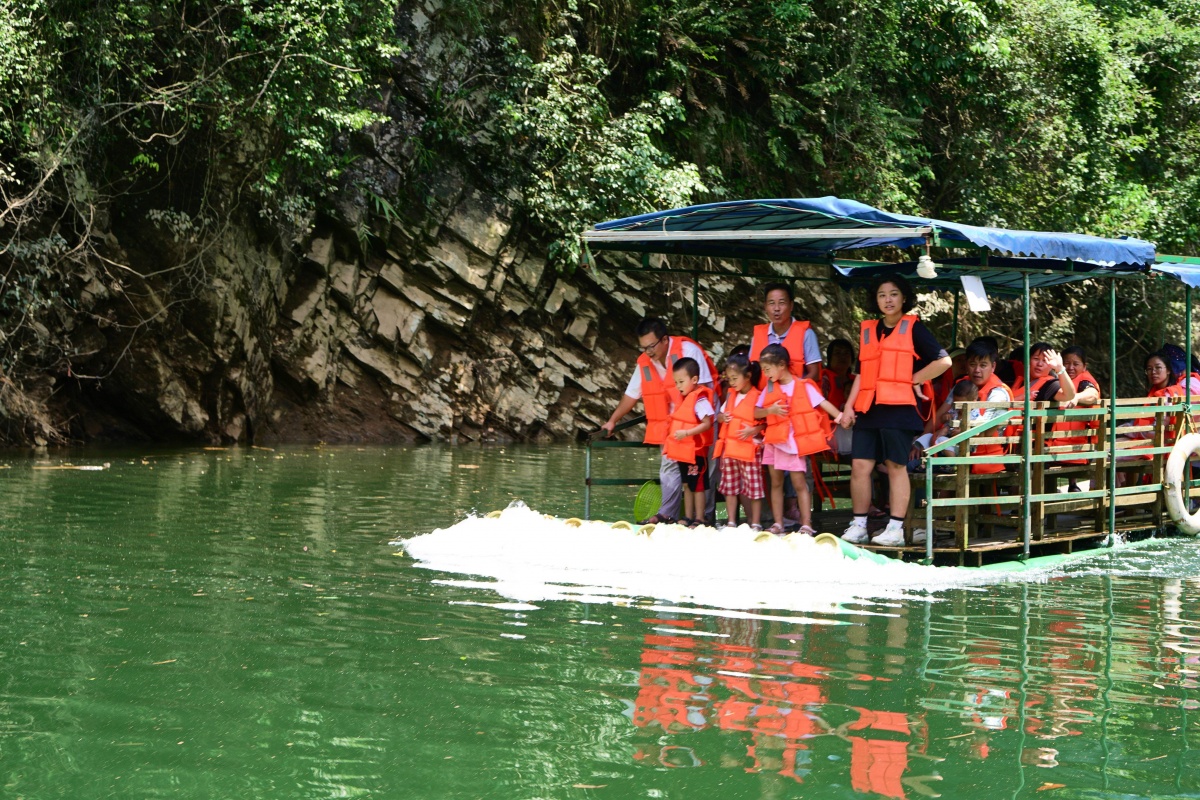 7月16日,游客在金秀瑶族自治县圣堂湖景区乘船游玩,乐享夏日清凉。通讯员 高如金 摄