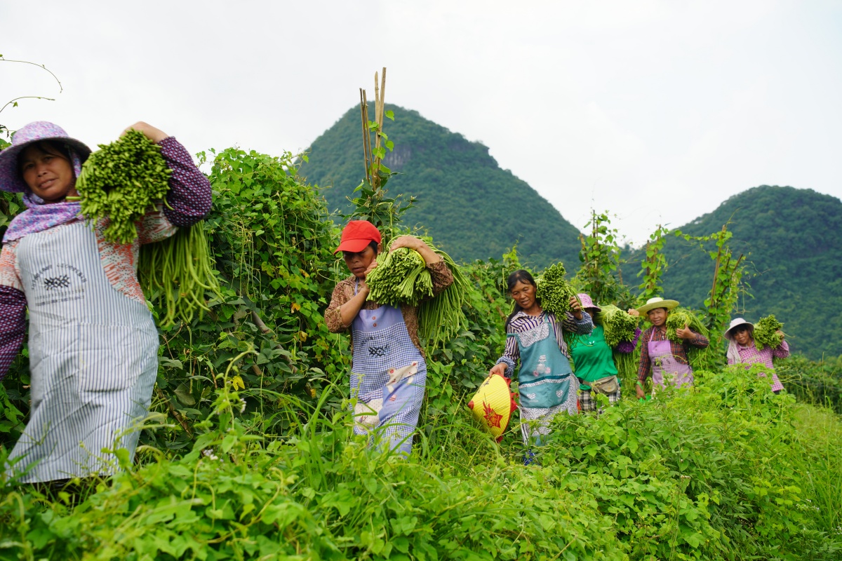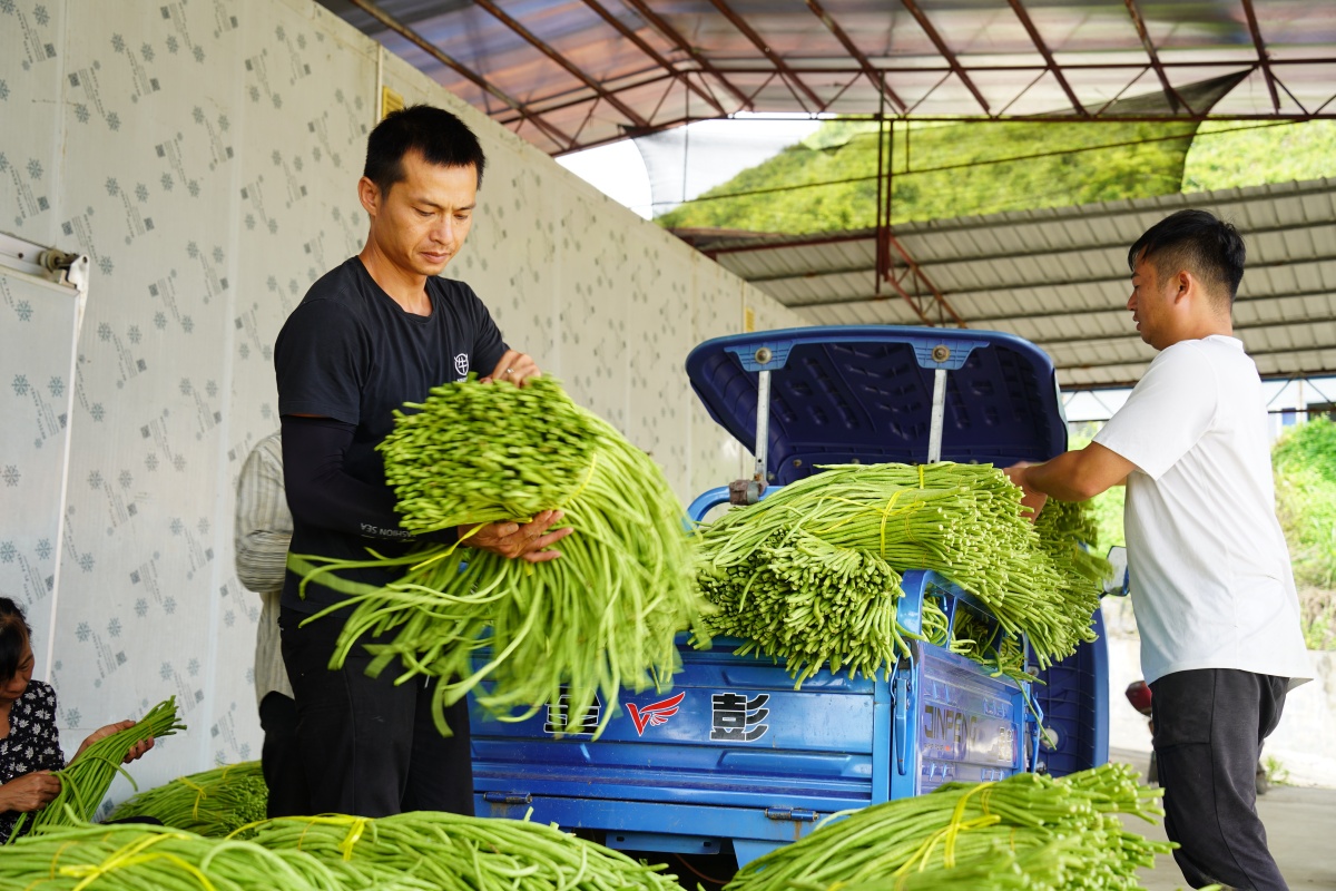 7月16日,走进罗城仫佬族自治县中石村呼略屯豆角种植基地,一排排长直嫩绿的长豇豆长势喜人、丰收在望,工人们正忙着采摘、分拣、装运,一番忙碌丰收的景象。通讯员 彭春涛 摄