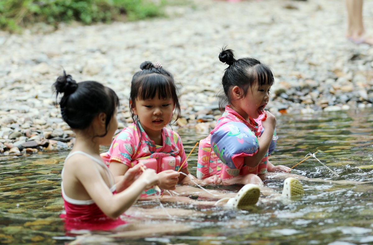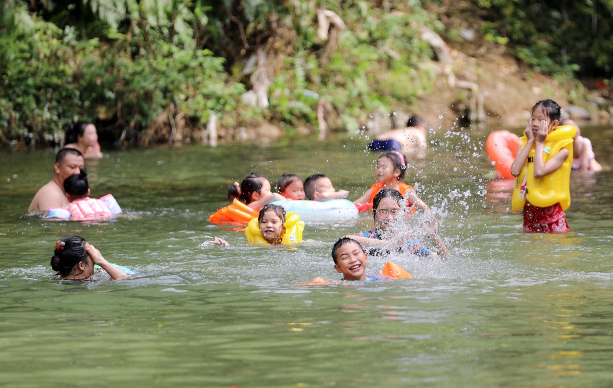 7月16日,孩子们在柳州市融安县长安镇河边戏水玩耍。随着高温天的持续,大家纷纷来此亲水消暑,乐享清凉。通讯员 韦荣军 摄