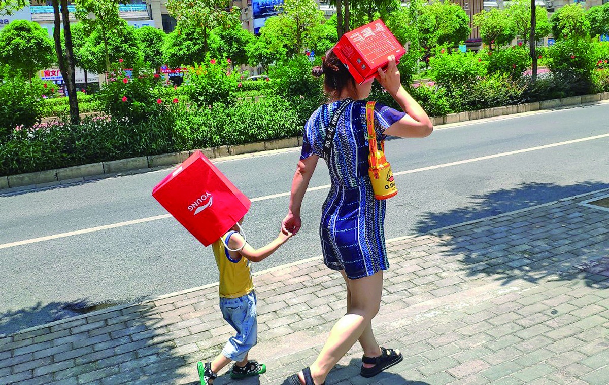 7月17日,南宁凤岭北,一名小孩用纸袋当帽子遮挡阳光。南国早报记者 何定坚 摄