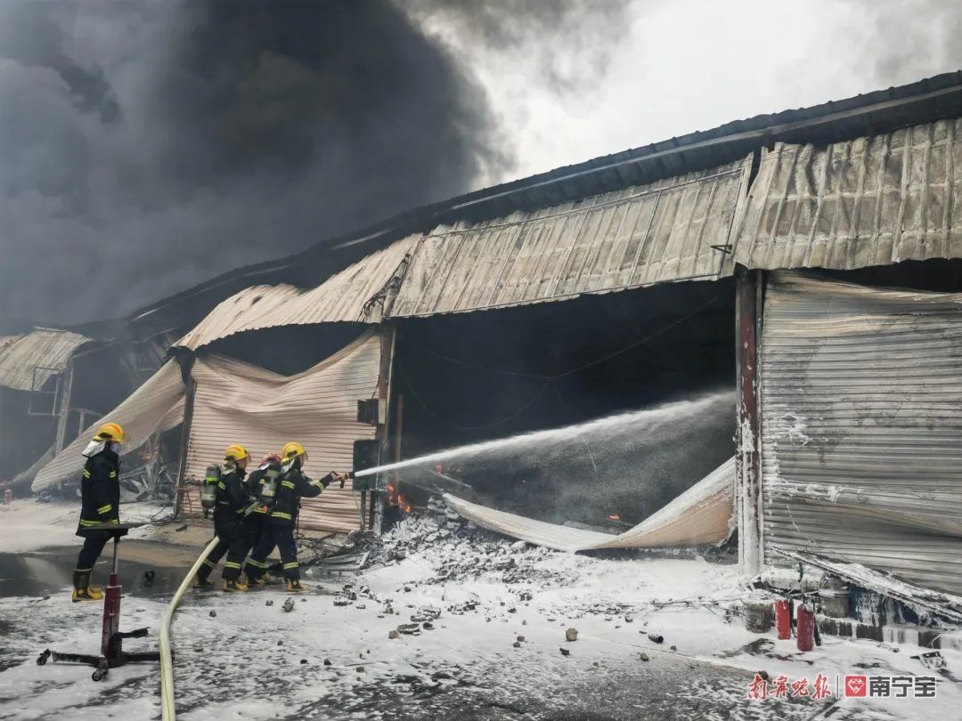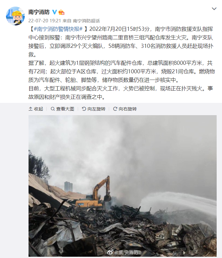 7月20日下午3时50分许,南宁市望州路南二里官桥三组汽配仓库突发火情。晚上7时21分,@南宁消防发布警情快报:起火建筑为1层钢架结构的汽车配件仓库,总建筑面积8000平方米,共有72间;起火部位于A区仓库,过火面积约1000平方米,烧毁21间仓库。燃烧物质为汽车配件、轮胎、脚垫等,储存物质数量仍在进一步核实中。目前,火势已被控制,现场正在扑灭残火。