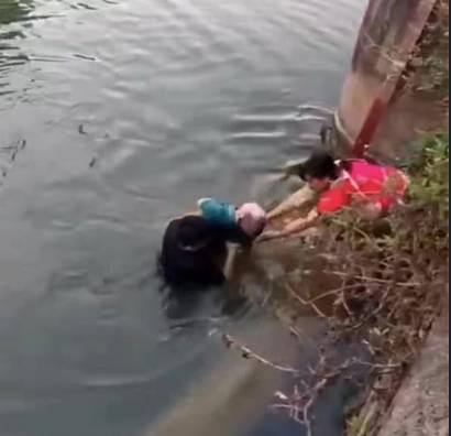 两人即将到达岸边时,一名系着围裙的妇女从河堤跳到岸边的水泥墩上,接力将老人拉上岸。
