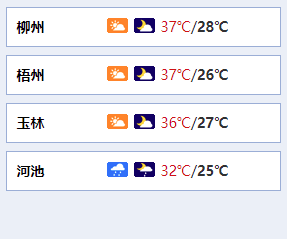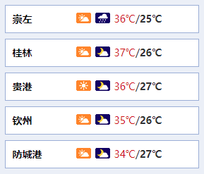 30日,桂西部分地区有中雨、局地暴雨到大暴雨并伴有短时雷暴大风等强对流天气,我区其它地区多云、局地有阵雨或雷雨。桂东、桂南大部最高气温35~37℃、局地38℃以上,我区其它地区32~35℃。