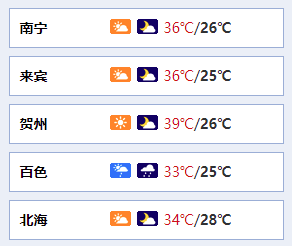 南宁市:今天白天到晚上,晴天到多云,偏南风1~2级,最高气温36℃,最低气温25℃。