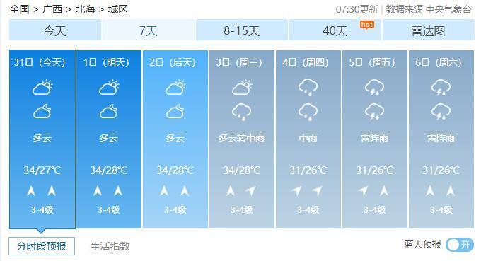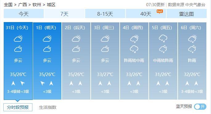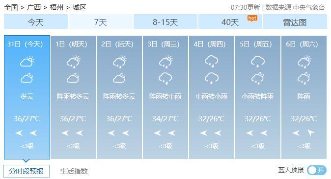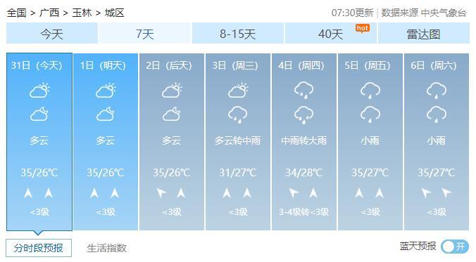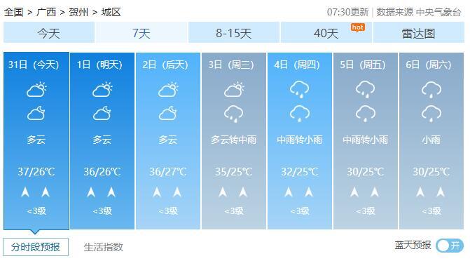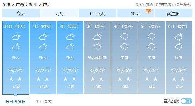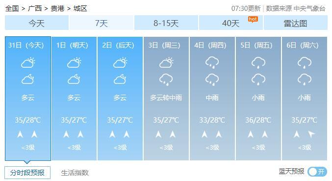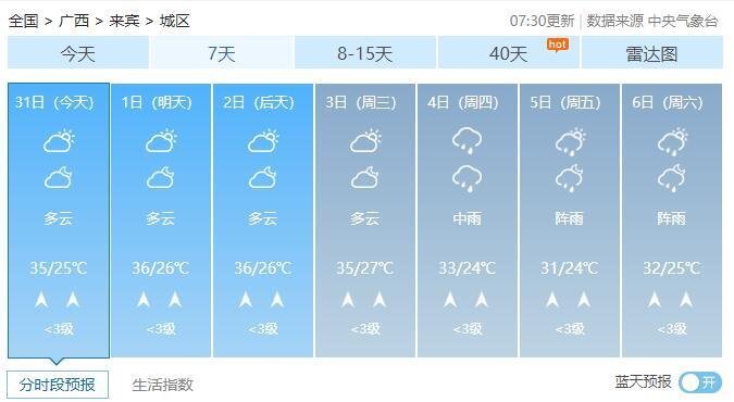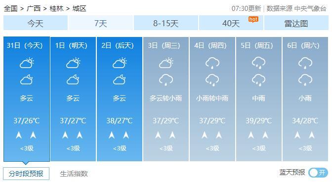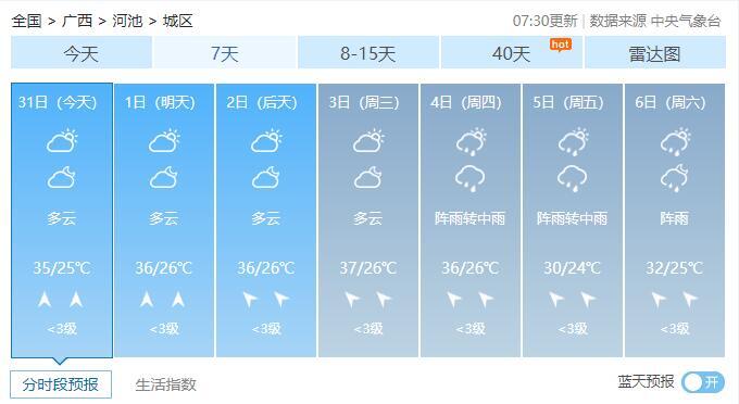 8月1-2日,全区多云到晴,其中桂西部分地区有阵雨或雷雨。最高气温全区大部35~37℃、局地38℃以上。