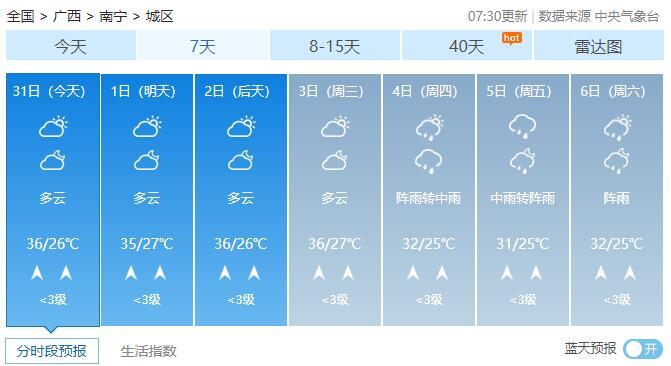 南宁市:今天白天多云间晴,午后局地有阵雨或雷雨,偏南风1~2级,最低气温26℃,最高气温36℃。