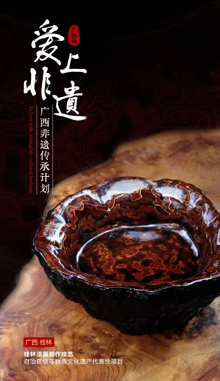 漆器最早起源于中国,在漫长的发展历程中,衍伸出桂林漆器这独具鲜明地域特色的一支。桂林漆器发源于西汉,定式于明末,是荆楚文化与岭南文化交融的产物,至今已有2200多年历史。