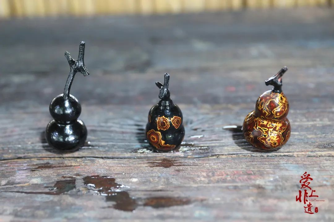 打磨前、正在打磨、打磨完成的葫芦漆器。杨思悦 摄