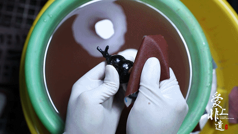 制好的胎体在生漆中浸泡,时长依着胎体的厚度会有不同,从十几秒到一星期不等。漆液充分渗透到胎体的孔隙中,使其更为结实。