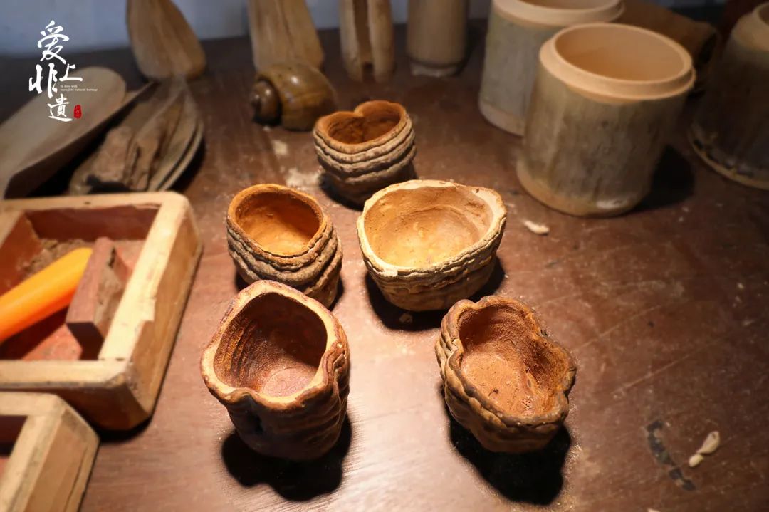 在形态基本固定的材料中,精选其一,切取合适的部分,用凿子、锉子将中间掏空,再用刻刀或粗砂纸将表面磨平整,这一步称为制胎。漆艺人会在保留胎体天然形态的基础上,根据自己的审美对胎体进行加工。