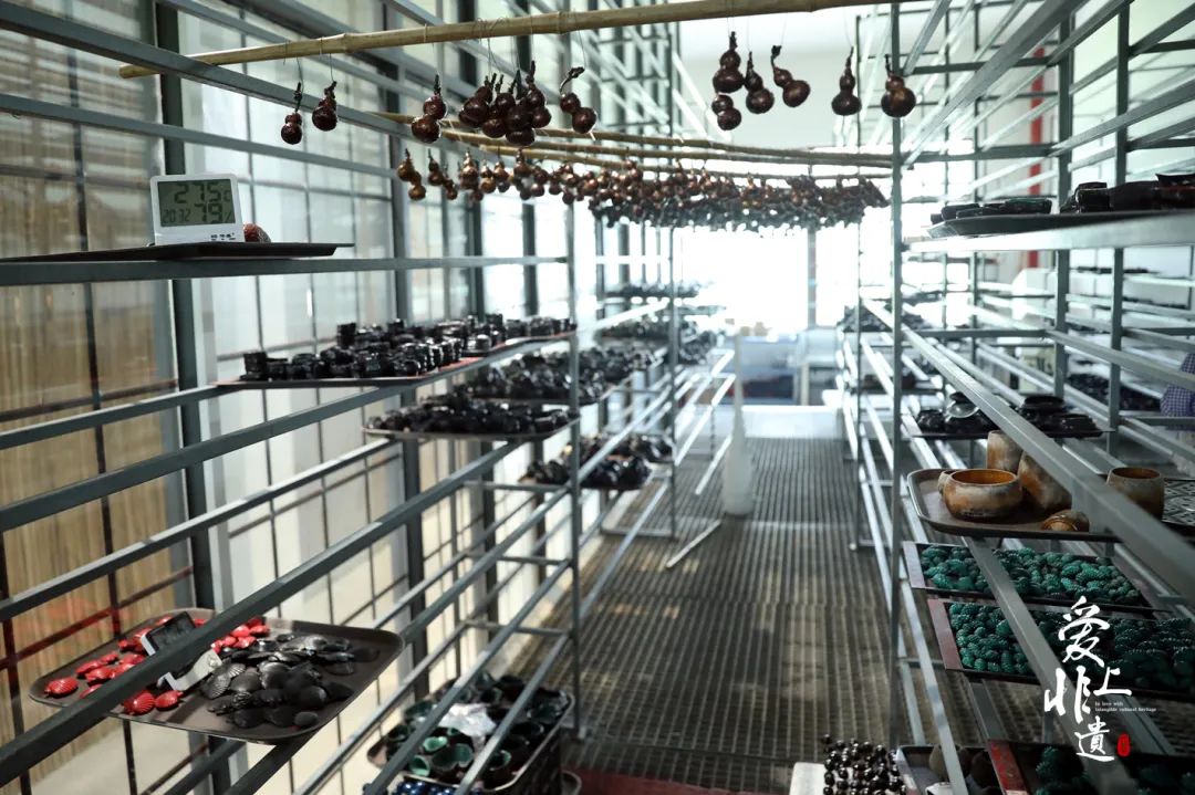 将胎体取出,刮掉表面多余的漆液,送入荫房中充分荫干。荫干的过程中,漆液会在胎体表面结成漆膜,环境需满足温、氧、水三个关键要素。当温度适当、水分充足,漆液中的物质就能在漆酶的催化下与空气中的氧、水充分反应。