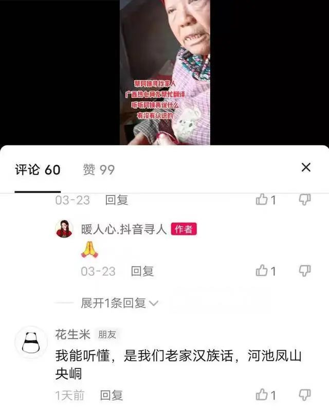 7月31日,广西“宝贝回家”志愿者“花生米”在抖音上看到“暖人心”发布的视频,留言说,老人的口音很像他们老家河池市凤山县一带人说的话。“暖人心”于是拜托“花生米”把视频转发到当地家族群进行扩散寻找。