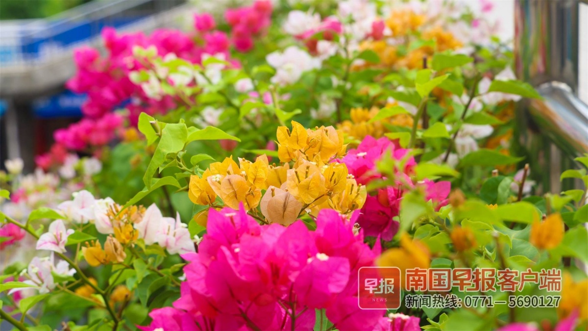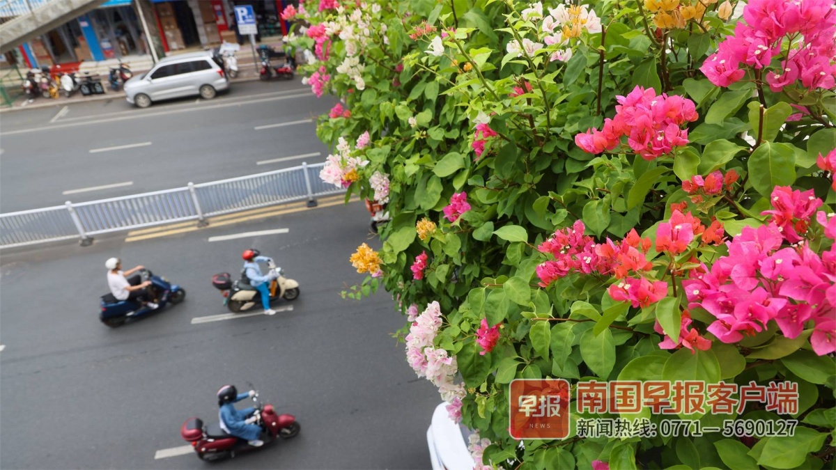 近日,在南宁市星湖路的一座人行天桥上,一树多色的三角梅正处于盛花期,在阳光下甚是好看,丰富了道路与天桥的色彩。