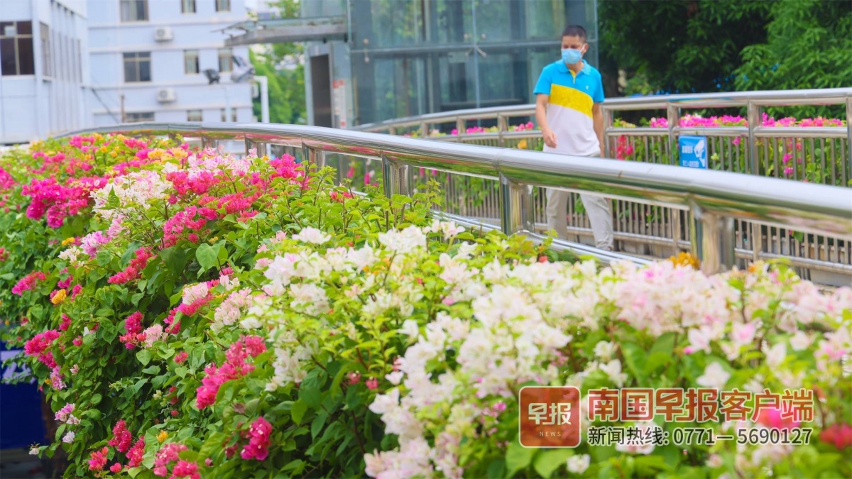 市民通过天桥时可以欣赏漂亮的多色三角梅。